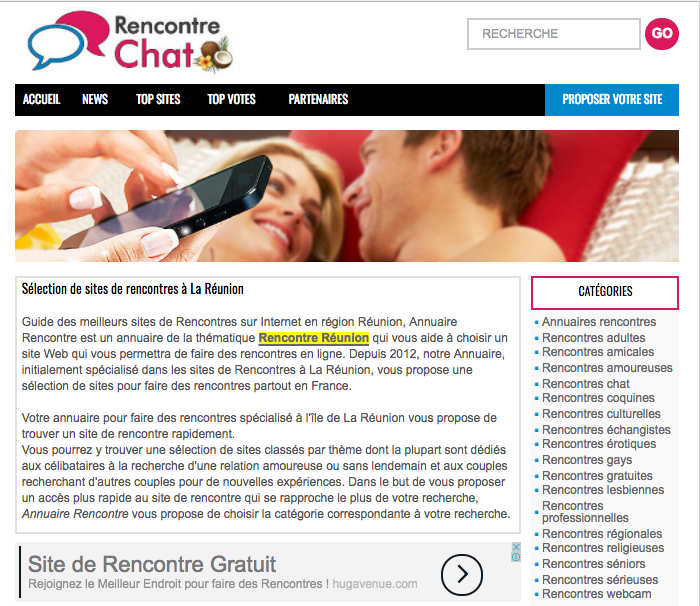 Annuaire des meilleurs sites de rencontre. L'annuaire Rencontre Chat vous propose une sélection d'adresses en ligne qui vous permettent de faire des rencontres de qualité à la Réunion. Avec cet annuaire reunionnais spécialisé de la thématique rencontre, facilitez vous vos recherches de sites et de services de rencontres locales sur internet. Trouvez le meilleur site de rencontre qui vous correspond.